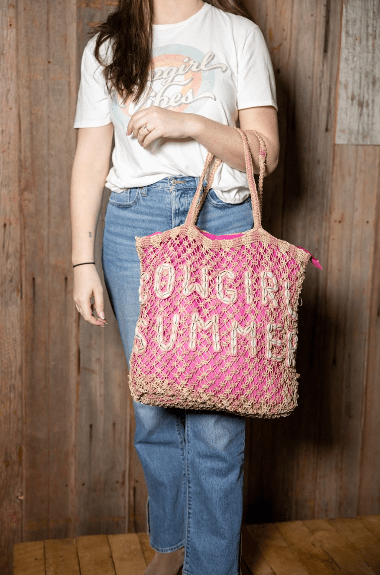 Features: "Cowgirl Summer" is spelled out in "Sea Shells". Pink & Cream netting makes up the body with a canvas & cotton material interior. Zip top for a secure closure. 1 zip and 2 slide in interior pockets.