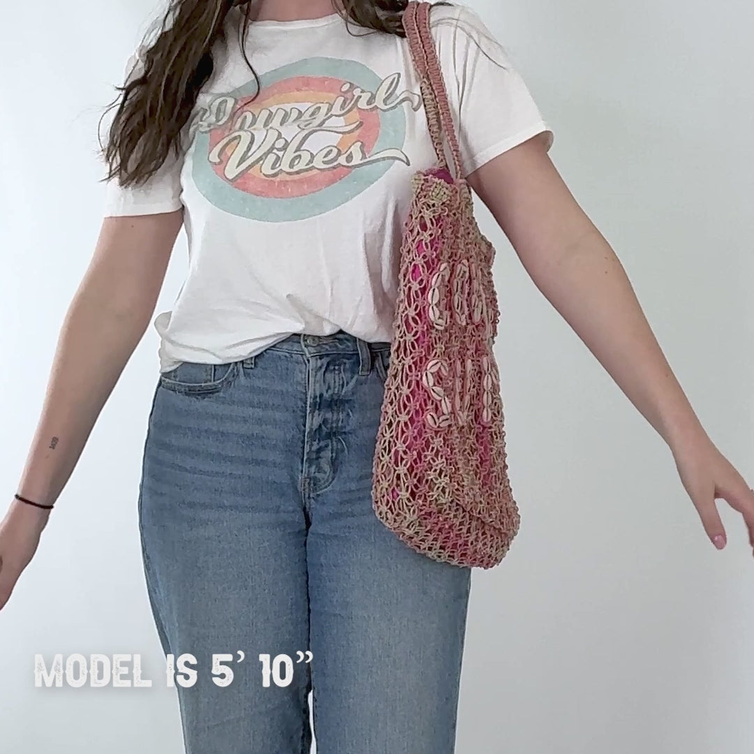 Why We 💕💕 It: Make a sustainable style statement with this artisanal netted tote featuring a charming and fun "COWGIRL SUMMER" message. Crafted from recycled materials in versatile pink and cream, this airy carryall combines eco-conscious design with everyday functionality. Perfect for conscious consumers who want to carry their essentials with smiling style.