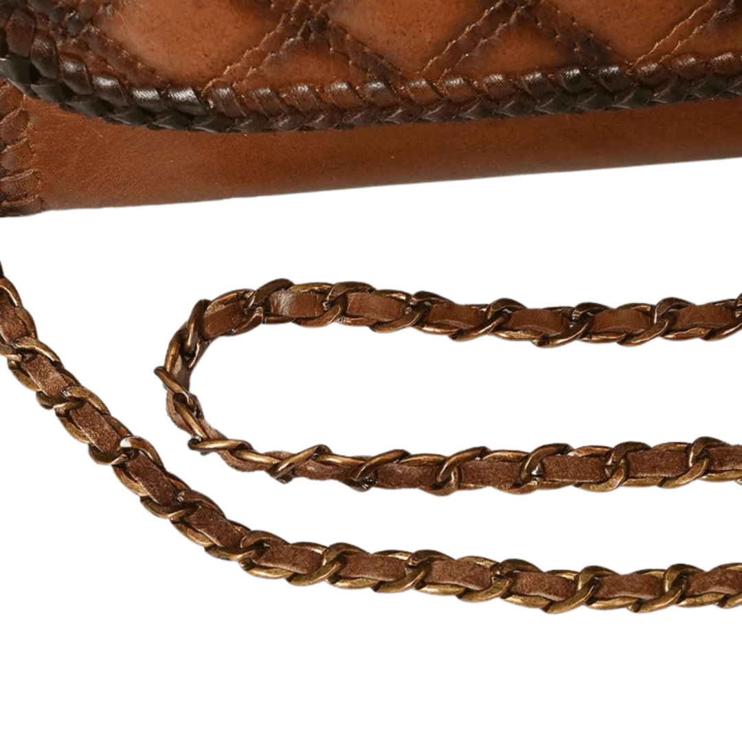 Features: Quilted Pillow Leather Flap, Smooth leather back with a zip pocket. chain crossbody strap with entwined leather. One zip pocket inside.