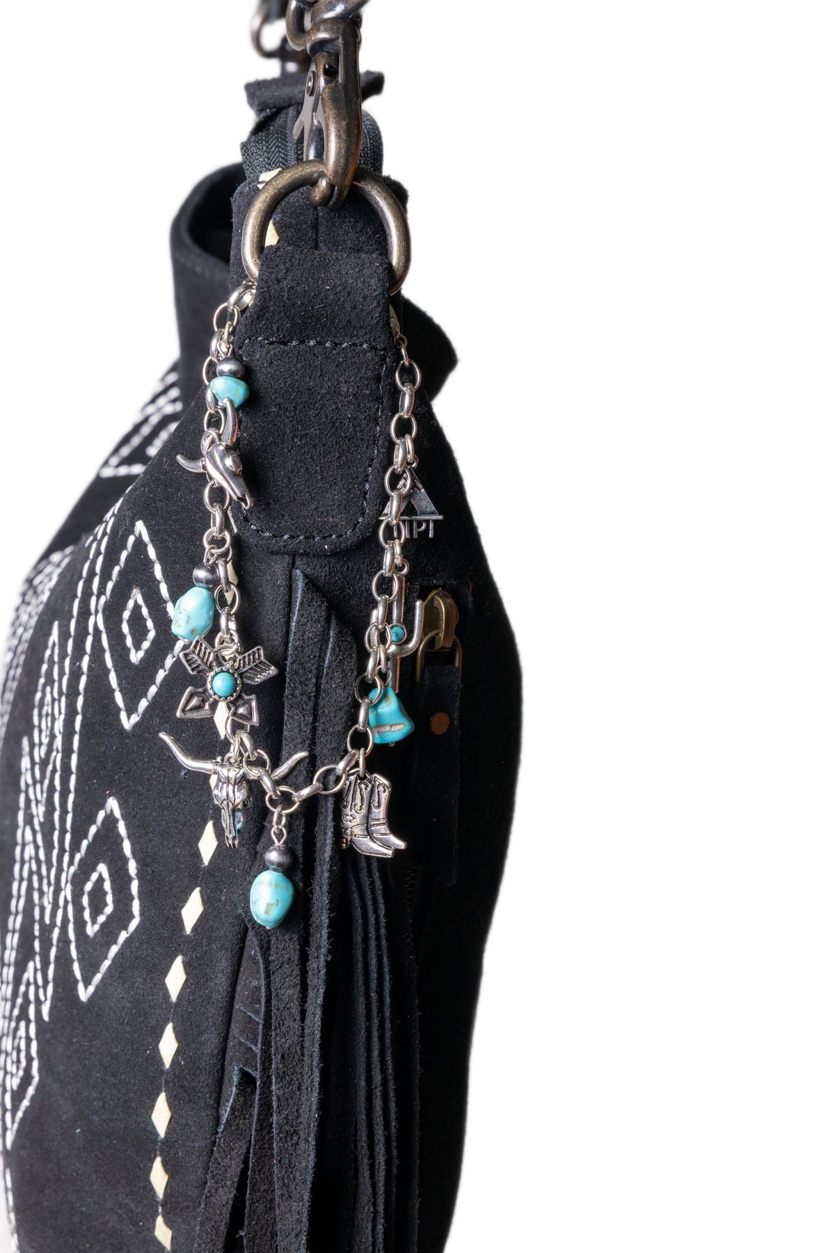 Features: Beads, faux turquoise stones, Tipi, cactus, cowboy boots, steer head with horns, crossed arrows, and 2 small lobster claw claps to attach to your bag.