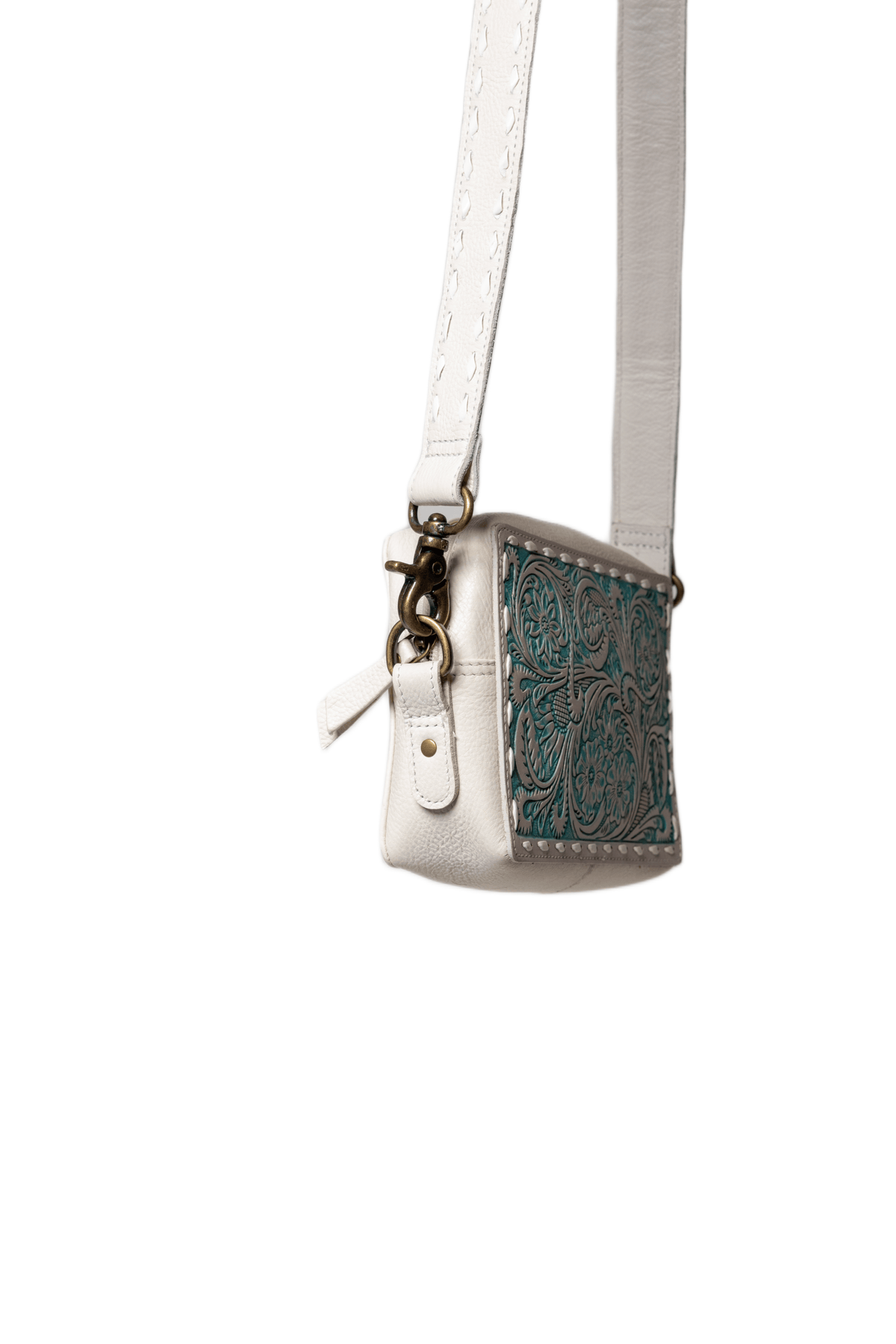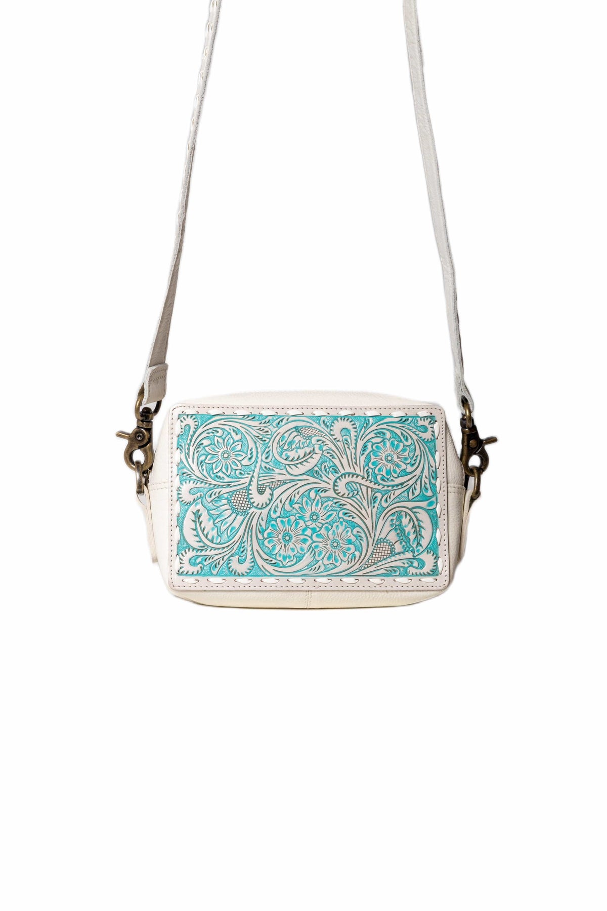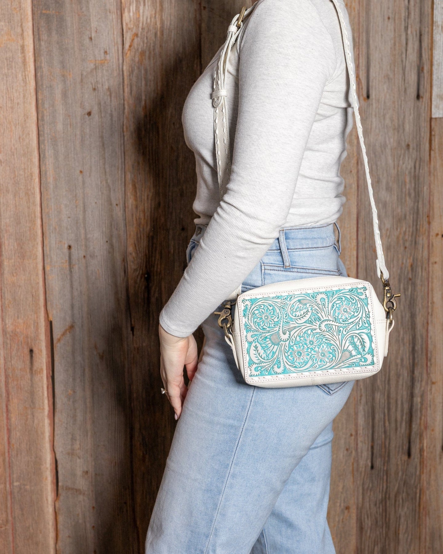 Why We ❤️ It:  Make a bold statement with our vibrant Ivory & Turquoise tooled leather crossbody bag, featuring intricate western-inspired leather front panel in rich ivory & turquoise tones. The perfect fusion of playful and sophisticated, this compact companion offers versatile styling with its adjustable strap and sleek silhouette. A true conversation starter!