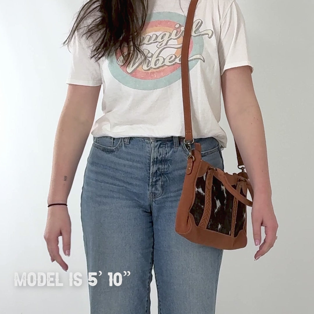 Features: Hair on hide, soft leather body, duel handles 5", Crossbody Strap 22", 5 card slots & 1 zip pocket inside. Zip top closure.